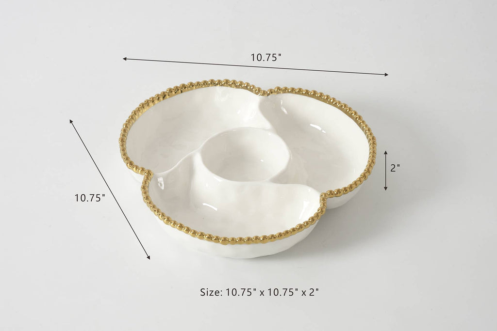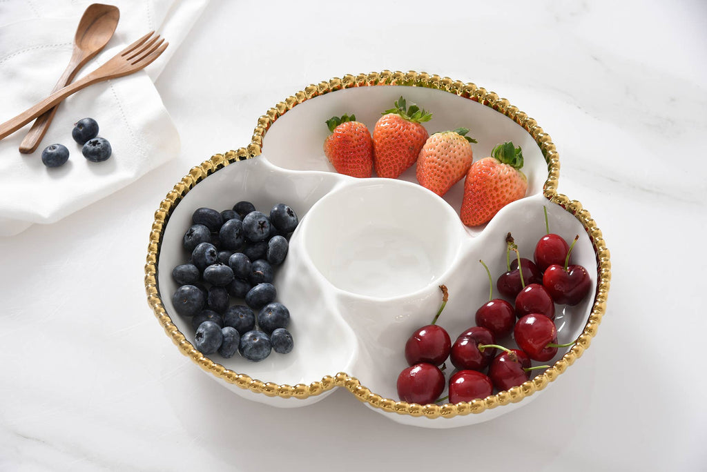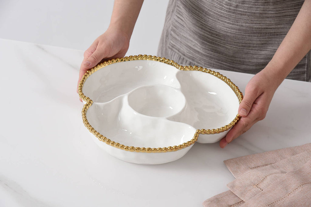 4 Section Server from our Golden Salerno Collection. Great for appetizers, tapas and antipasto. Or use for toppings for a make your own sundae, taco or pizza night – the options are endless! Gleaming white porcelain with lustrous gold beads. Food safe, dishwasher safe, oven safe to 500°. Tarnish and stain-free. Easy Care.