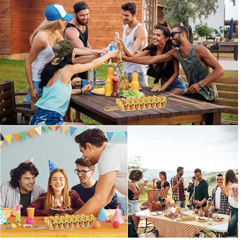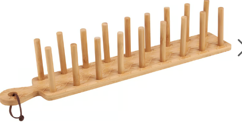 A wooden taco holder from our Foodie Collection made with bamboo displaying a textured Aztec pattern along the base. Holder features wooden pegs that create space for up to 8 tacos. Assembly required before using. Our Aztec Pattern taco holder includes a leather loop to easily hang when not in use. Hand wash only. A piece of fun tableware perfect for everyday gatherings.