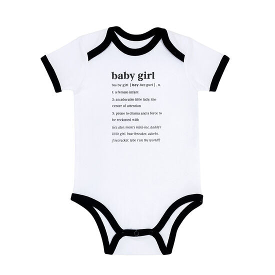 Life is what you define it! Our Defined bodysuits feature fun and original baby themed definitions. Featuring bottom snaps for easy dressing, these adorable bodysuits are made with soft and stretchy cotton that is breathable and comfortable all day long. Perfect baby shower gifts for new Mom's and Dad's. Size 3_6 months. Machine wash cold. Tumble dry low.