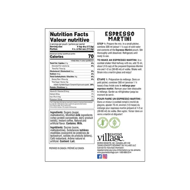 This classic drink has made a strong come back in the cocktail world. It makes for a great pre or post dinner pick me up. Our mix makes it so easy to prepare, just add water, ice and vodka. Shake and serve in a classic Martini glass garnished with a couple of coffee beans. Makes 4 servings. Net Weight 70g (2.5 oz).