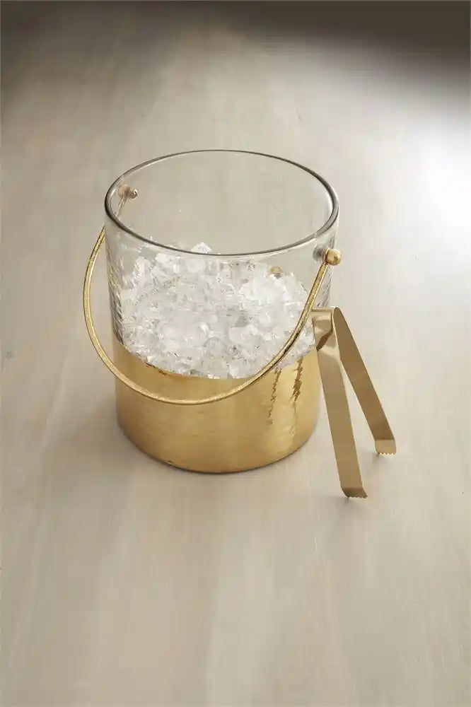 Whether you're hosting a holiday gathering or New Years' party, our Gold ice bucket set is perfect. The two-piece set comes with a hand-painted and hammered glass ice bucket. The bottom of the ice bucket features a gold coloring. The bucket comes with stainless steel tongs. This will become your staple piece for your bar cart while hosting and is perfect for storing champagne bottles.