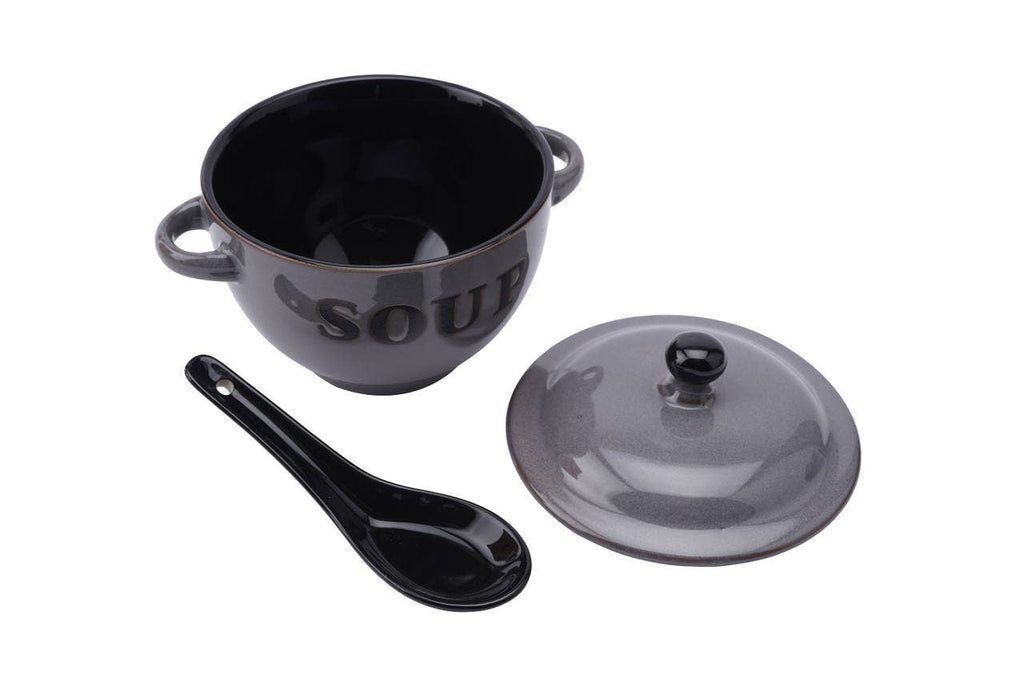 A Country Inspired Design | A beautiful grey ceramic soup bowl with the slogan 'Soup' in black font and has a lid and a spoon too! Comes Gift Boxed | Packaged in a beautiful brown craft box it makes a lovely thoughtful gift. Microwave and Dishwasher | Focus more on the eating and enjoying of your food, this soup bowl is safe for both Microwave and Dishwasher use, helping you cook and clean as stress-free as possible. Also by being made from 100% stoneware, it's naturally more chip-resistant than other ceramic types. Dimensions | Height: 13cm x Diameter: 15cm x Depth: 12cm Designed in Cornwall | From the Soup Bowl collection by CGB Giftware