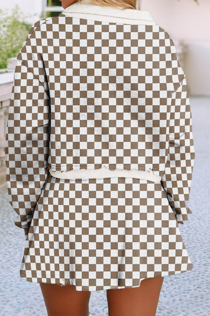 Checkered Print Polo Collar Cropped Top Mini Skirt Set