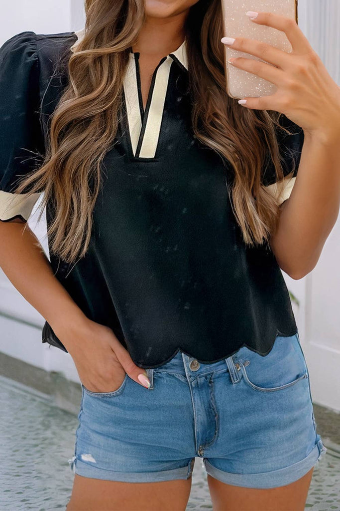 Style Casual Pattern Colorblock Occasion Daily Season S/S 🌸 Add a touch of elegance to your wardrobe with this sophisticated blouse, featuring a distinctive color contrast scalloped hem that enhances its feminine appeal. 👚 Designed with a collared V-neck and puff sleeves, it combines classic elements with a modern twist, ensuring a comfortable yet stylish fit. 👖 Effortlessly versatile, this blouse pairs beautifully with jeans, casual pants, or skirts, making it a perfect choice for both casual and formal settings.Â