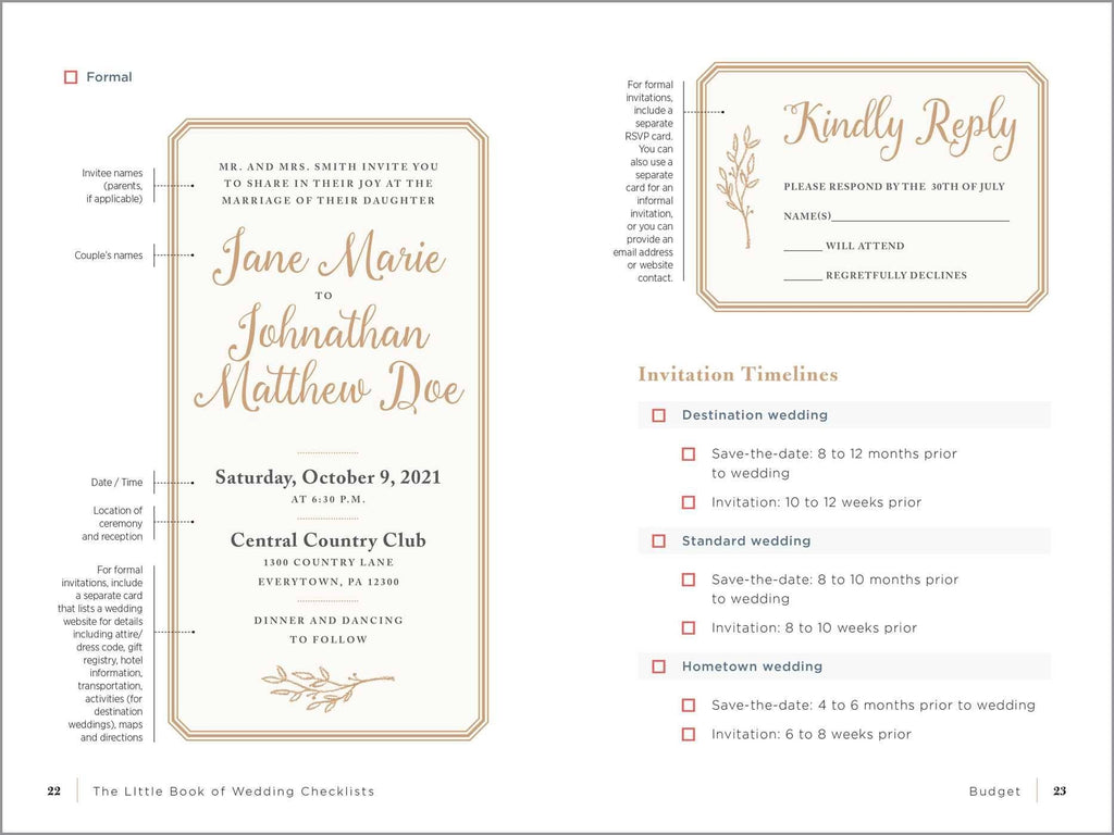 This wedding planner includes: Low-key or lavish—Customize checklists to suit your wedding size and budget, whether it’s a traditional ceremony, distant destination, backyard bash, or something completely different.