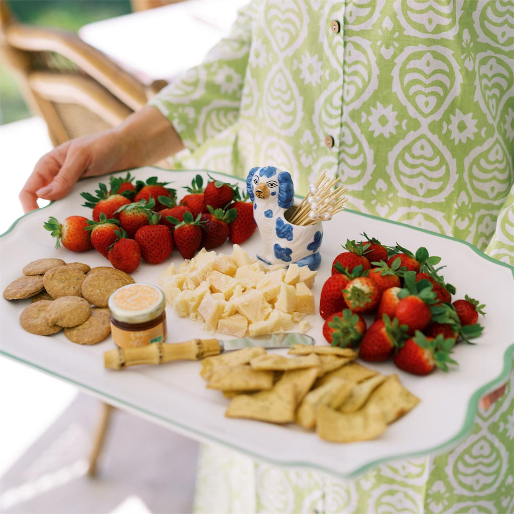 A perfect addition to your dinner table, this pick holder features a blue and white hand painted Staffordshire dog. The bamboo picks are perfect for serving appetizers or cocktail garnishes.