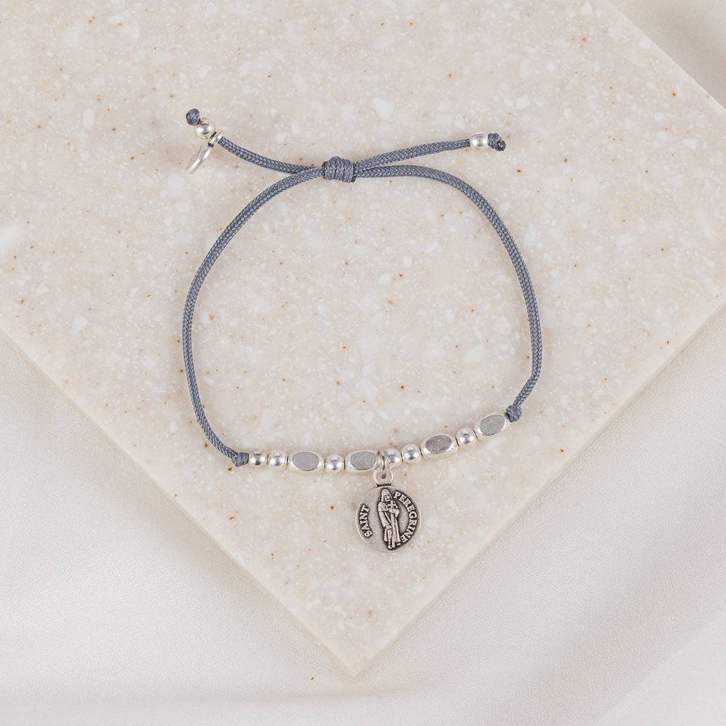 The Little Saints - Saint Peregrine - Silver Saint Peregrine Virtue: Healing • Feast Day: May 1 St. Peregrine is the Patron Saint of cancer patients & life threatening diseases. Adjustable slate grey bracelet cording which opens to 9.5" circumference Each bracelet is handwoven in Kampala, Uganda Silver-tone metal beads Round Archangel Michael medal Medals made in Italy Each bracelet comes on an inspirational card.