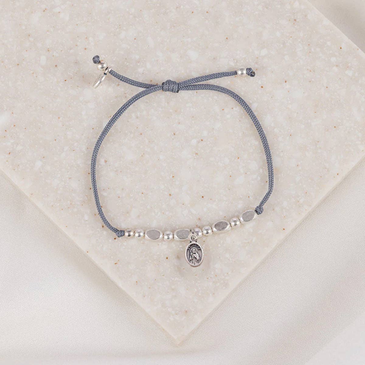 The Little Saints - St. Jude - Silver St. Jude is the Patron Saint of desperate causes. Virtue: Healing and Hope Feast Day: October 28 Adjustable slate grey bracelet cording which opens to 9.5" circumference Each bracelet is handwoven in Kampala, Uganda Silver-tone metal beads St. Benedict Medal Medals made in Italy Each bracelet comes on an inspirational card.